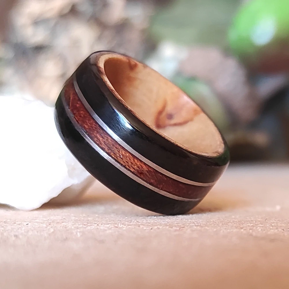 Dřevěný prsten z ebenu, břízy a jatoby