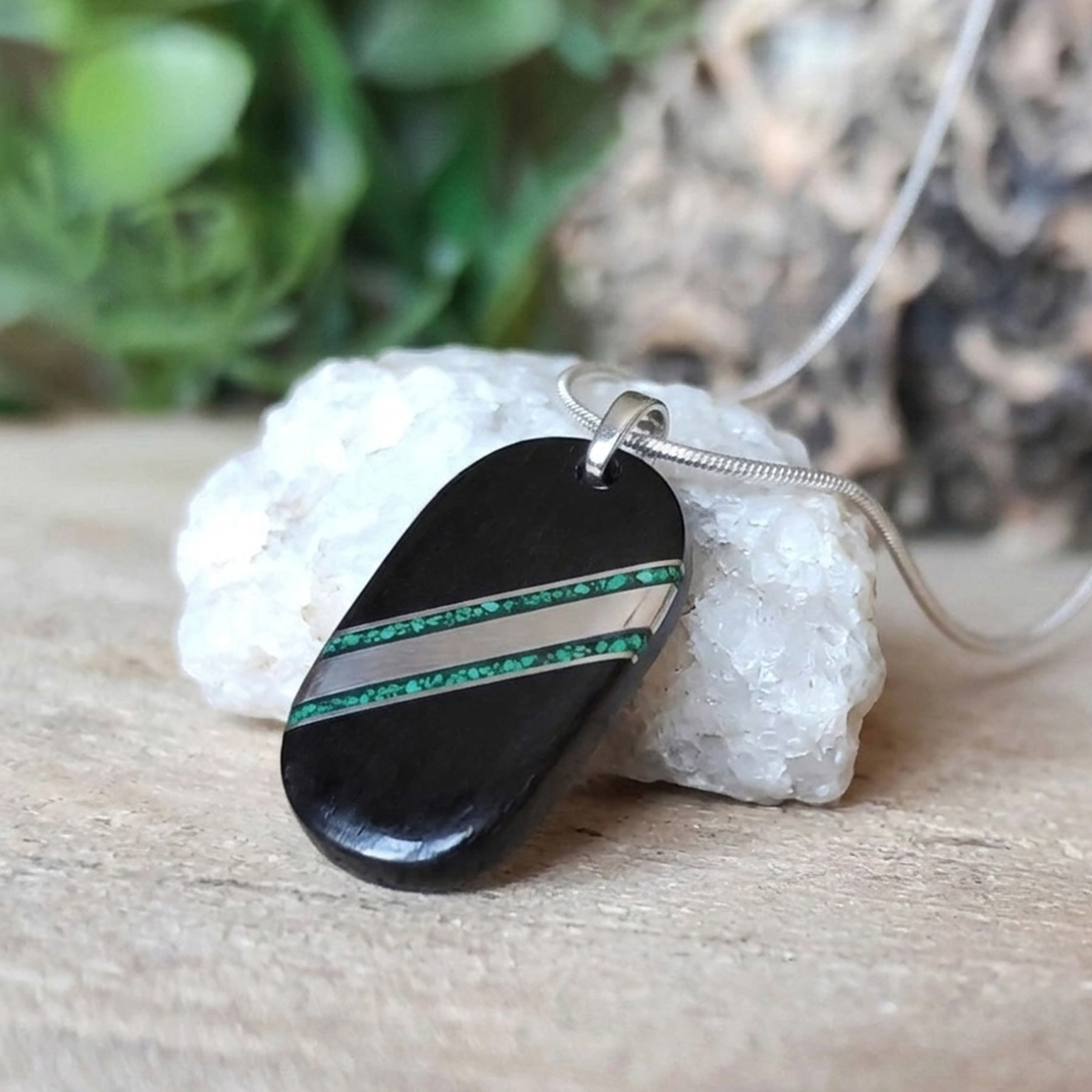 Ručně vyrobený pánský přívěšek ze dřeva EBENU, ve kterém je vyleštěná chirurgická ocel a kamínky malachitu. Přívěšek je včetně řetízku z chirurgické oceli, který nečerná a je vhodná i pro alergiky. Tento šperk představuje eleganci a styl. Tento originální přírodní šperk bude slušet každému, kdo miluje přírodu. Vyrobeno s láskou ke dřevu.