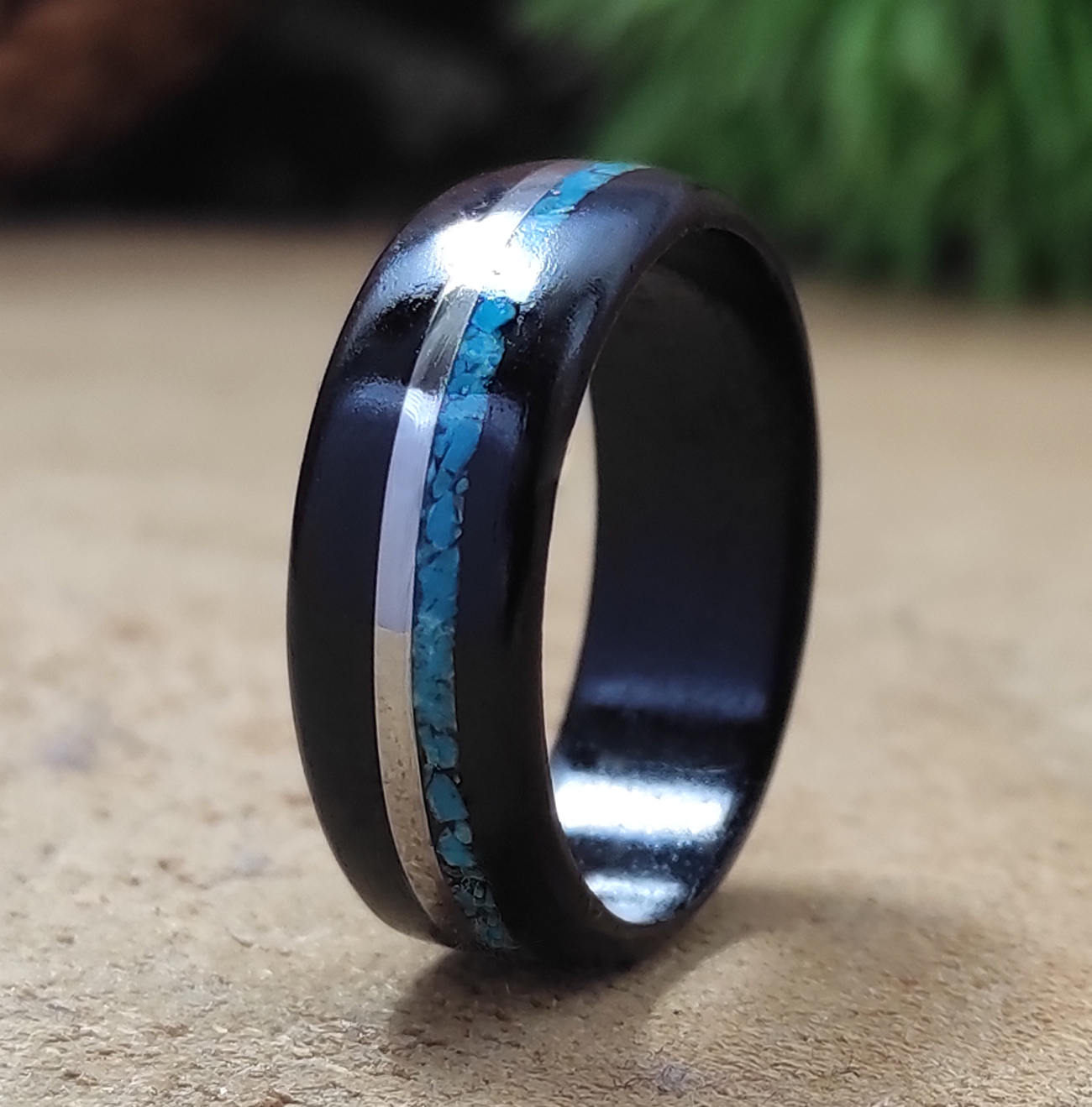 Ručně vyrobený unisex přírodní prsten z exotického dřeva EBENU, do kterého byl vyřezán proužek a zasazeny kamínky tyrkysu a chirurgická ocel, která je vhodná pro alergiky a nečerná, navíc vysoce leštěná. Tento prsten představuje eleganci a styl, jenž vyzdvihne jedinečnost a originalitu svého nositele. Tento přírodní šperk je vhodný pro ženy a muže, kteří se chtějí odlišit a prezentovat svou náklonnost k přírodě. Vyroben s láskou ke dřevu.