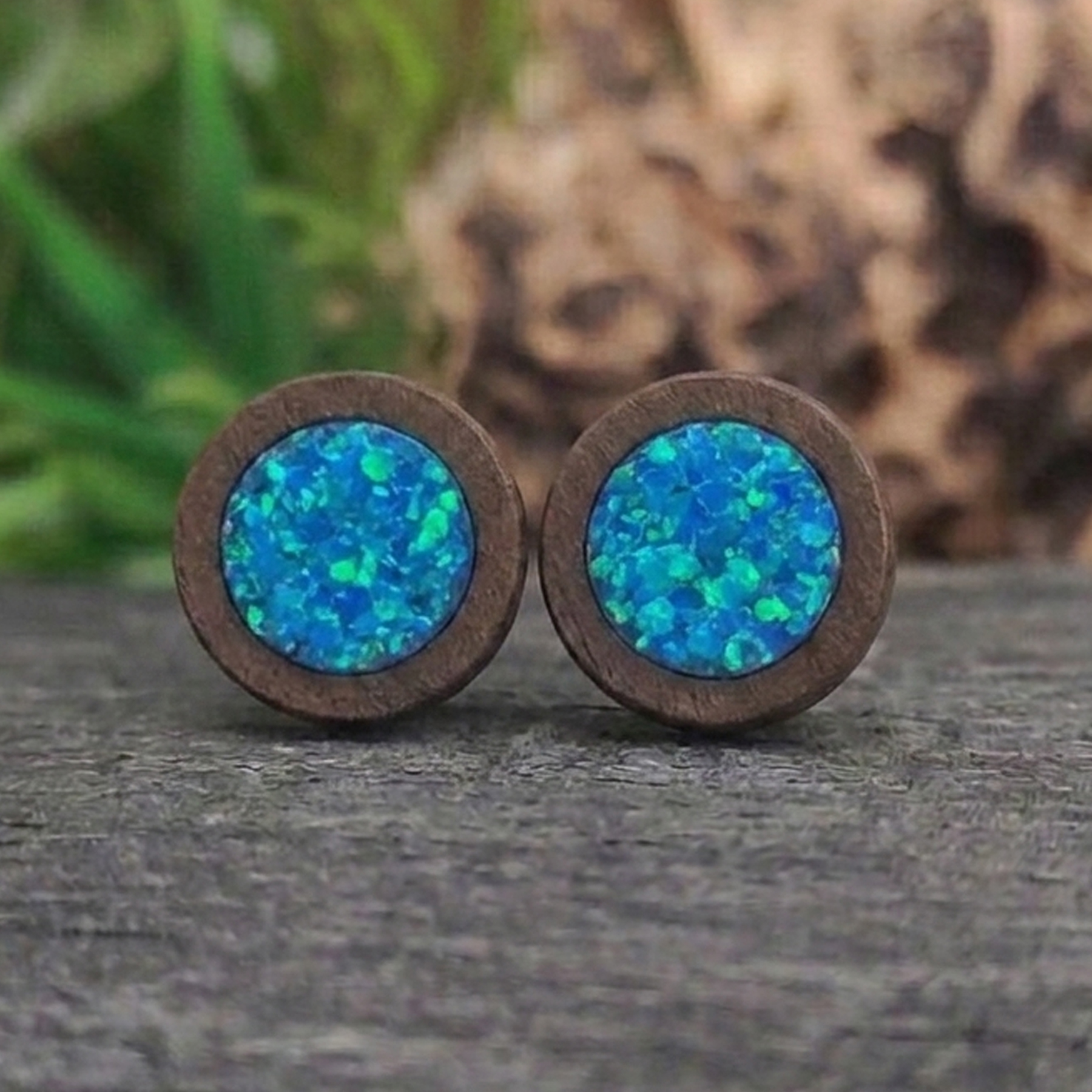 Ručně vyrobené a detailně propracované dámské náušnice - pecky z amerického ořechu. V náušnicích jsou kamínky modrozeleného OPÁLU.Lůžko náušnic a zapínání je z chirurgické oceli, která nečerná, je vyleštěná a vhodná pro alergiky. Zapínání náušnic je na puzetu. Tento originální přírodní šperk bude slušet každé ženě či dívce, která miluje přírodu. Vyrobeny s láskou ke dřevu.
