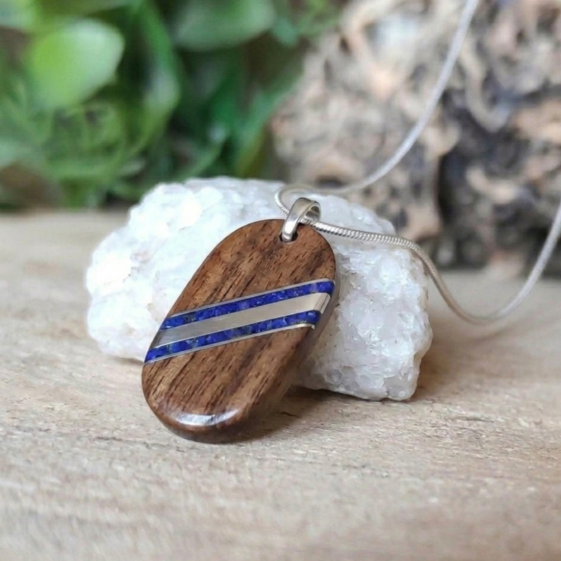 Pánský dřevěný náhrdelník s ocelí a lapis-lazuli