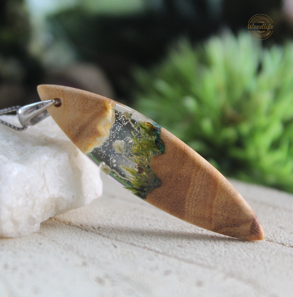 Ručně vyrobený UNIsex dřevěný náhrdelník ve tvaru loďky, který vznikl zalitím přírodního mechu, květů (v suché podobě) a kamínky Malachitu křišťálovou pryskyřicí do překrásného dřeva OLIVY. Tento šperk představuje eleganci a styl. Tento originální přírodní šperk bude slušet každé ženě nebo muži, kteří milují přírodu. Vyrobeny s láskou ke dřevu.
