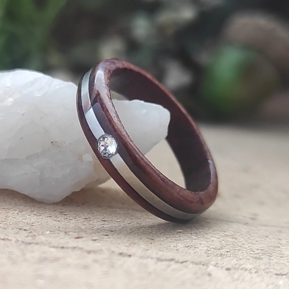 Ručně vyrobený přírodní  minimalistický prsten z exotického dřeva BUBINGA , do kterého byl vyřezán proužek a vsazen plát chirurgické ocele (protialergení - vhodná je tedy i pro alergiky), která byla navíc vyleštena. Uprostřed prstenu je zasazen krystal od značky Swarovski v odstínu Crystal F. Tento prsten představuje eleganci a styl, jenž vyzdvihne jedinečnost a originalitu svého nositele. Tento přírodní šperk je vhodný pro ženy, tak muže, které se chtějí odlišit a prezentovat svou náklonnost k přírodě. Vyroben s láskou ke dřevu.