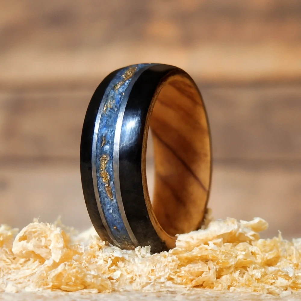 Ručně vyrobený prsten ze dřeva olivy a ebenu (výroba technikou bentwood-oproti vyřezání z jednoho kusu je tento prsten mnohem pevnější a odolnější). V prstenu jsou kamínky lapis lazuli a plátky zlata a dva proužky chirurgické ocele, která je vhodná i pro alergiky. Tento prsten představuje eleganci a styl, jenž vyzdvihne jedinečnost a originalitu své nositelky. Tento přírodní šperk je vhodný pro ženy nebo muže, kteří se chtějí odlišit a prezentovat svou náklonnost k přírodě. Vyroben s láskou ke dřevu.