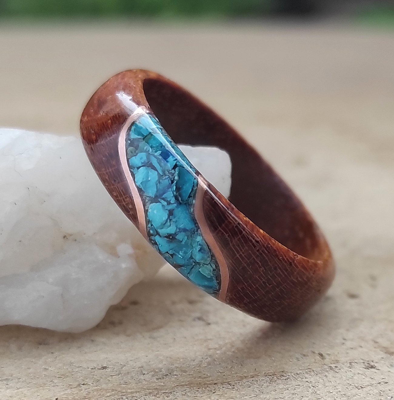 Ručně vyrobený krásný přírodní dámský prsten z exotického dřeva JATOBY, do kterého byly vsazeny kamínky CHRYZOKOLU.Do prstenu byly vloženy dva pláty měďi. Tento šperk představuje eleganci a styl, jenž vyzdvihne jedinečnost a originalitu svého nositele. Tento přírodní šperk je vhodný pro ženy a muže , kteří se chtějí odlišit a prezentovat svou náklonnost k přírodě. Vyroben s láskou ke dřevu.