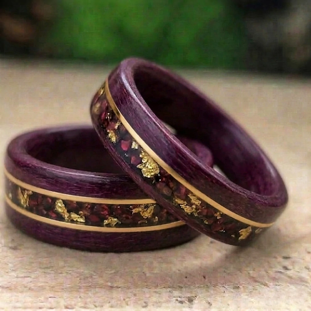 Ručně vyrobené snubní prsteny z exotického dřeva AMARANTH (nazývané také jako purpurové dřevo), do kterého byl vsazen proužek 14K zlata (gold filled). ( lze zasadit i chirurgickou ocel). V prstenu jsou kamínky českého granátu a plátky zlata. Prsteny jsou vyrobeny technikou bentwood, díky tomu jsou velice pevné a odolné. Tento prsten představuje eleganci a styl, jenž vyzdvihne jedinečnost a originalitu svého nositele. Tento přírodní šperk je vhodný pro ženy, které se chtějí odlišit a prezentovat svou náklonnost k přírodě. Vyroben s láskou ke dřevu.