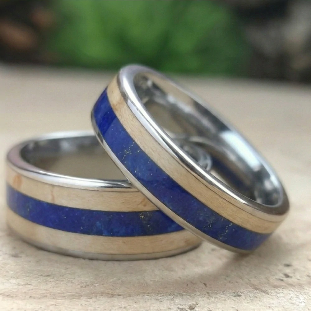 Krásné snubní ocelové prsteny, které jsou osázeny přírodními kamínky lapis-lazuli. V prstenech je finská bříza.