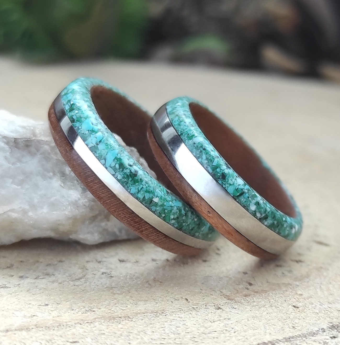 Ručně vyrobené snubní prsteny ze dřeva TŘEŠNĚ AMERICKÉ. V prstenu je vyřezán proužek a vsazeny kamínky malachitu a jadeitu tyrkysu. Navíc je v prstenu proužek vyleštěné chirurgické ocele typ 316L (vhodná pro alergiky). Tyto prsteny představují eleganci a styl, jenž vyzdvihne jedinečnost a originalitu svého nositele. Tento přírodní šperk je vhodný pro ženy, tak muže, kteří se chtějí odlišit a prezentovat svou náklonnost k přírodě. Vyroben s láskou ke dřevu.