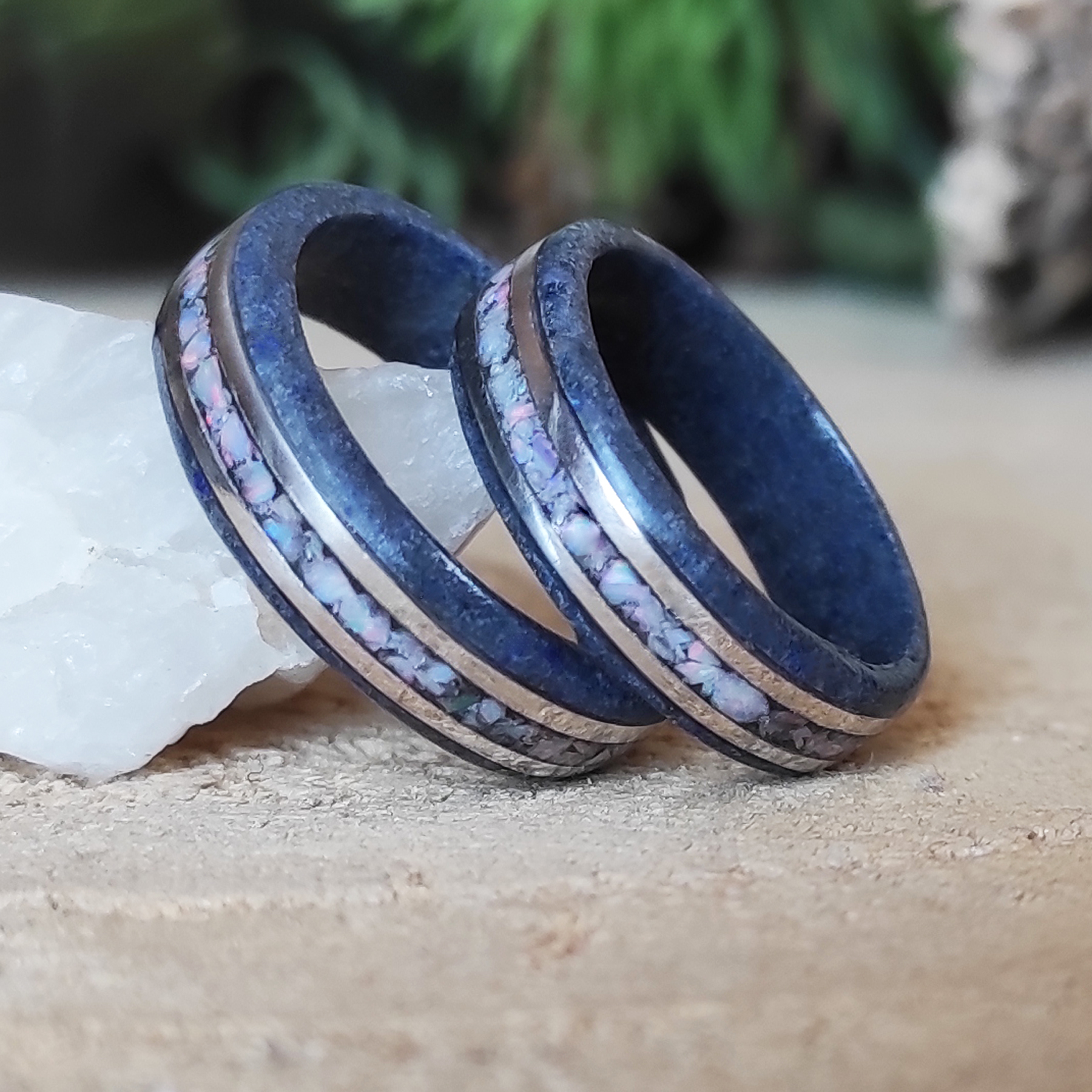 Ručně vyrobené snubní prsteny z kamenelapis lazuli, do kterého byl vyřezány dva proužky a vsazena chirurgická ocel a kamínky opálu. Tyto prsteny představují eleganci a styl, jenž vyzdvihne jedinečnost a originalitu svého nositele. Tento přírodní šperk je vhodný pro muže a ženy, kteří se chtějí odlišit a prezentovat svou náklonnost k přírodě. Vyroben s láskou ke dřevu.