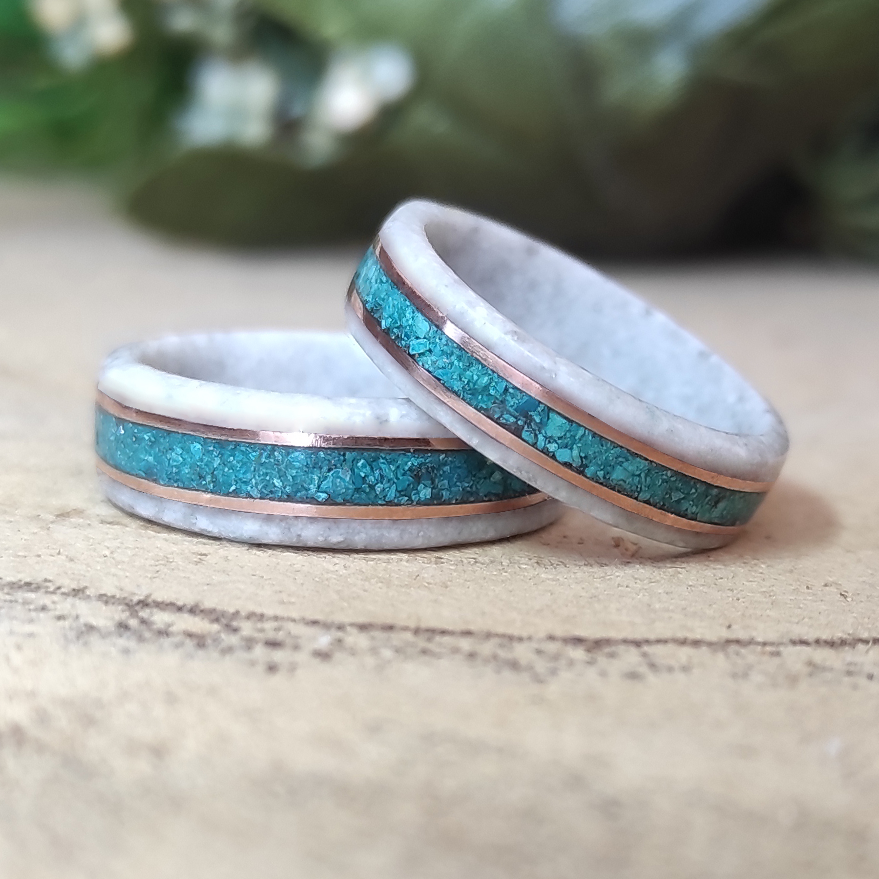Ručně vyrobené snubní prsteny z kamene magnezitu a chryzokolu, do kterého byl vyřezán proužek a vsazena vyleštěná měď. (měd je přestříkáná ochranným lakem proti zčernání). Tyto prsteny představujíeleganci a styl, jenž vyzdvihne jedinečnost a originalitu svého nositele. Tento přírodní šperk je vhodný pro ty, kteří se chtějí odlišit a prezentovat svou náklonnost k přírodě. Vyroben s láskou ke dřevu.