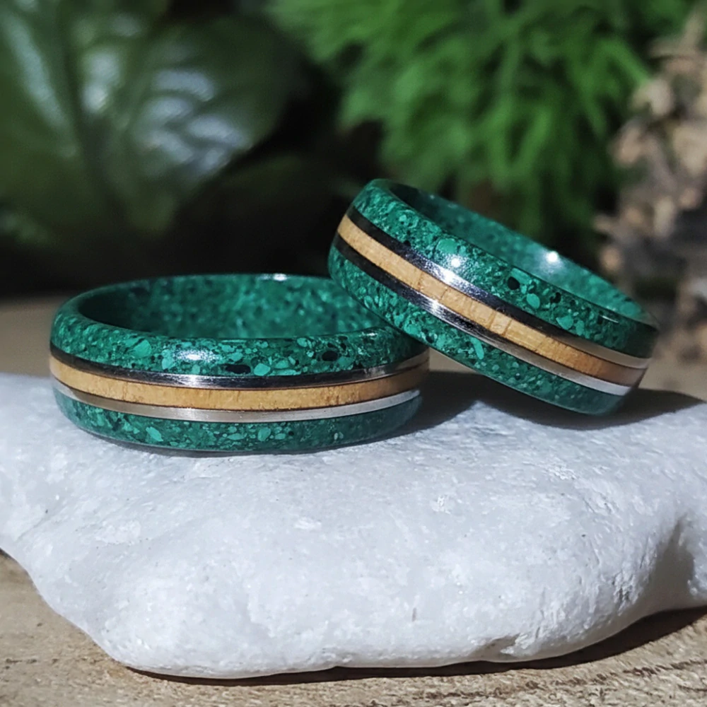 Ručně vyrobené snubní prsteny z kamenemalachitu a dřeva olivy. Uprostřed prstenu jsou dva proužky chirurgické ocele, která je protialergení a vyleštěná. Tyto prsteny představují eleganci a styl, jenž vyzdvihne jedinečnost a originalitu svého nositele. Tento přírodní šperk je vhodný pro muže, kteří se chtějí odlišit a prezentovat svou náklonnost k přírodě. Vyroben s láskou ke dřevu.