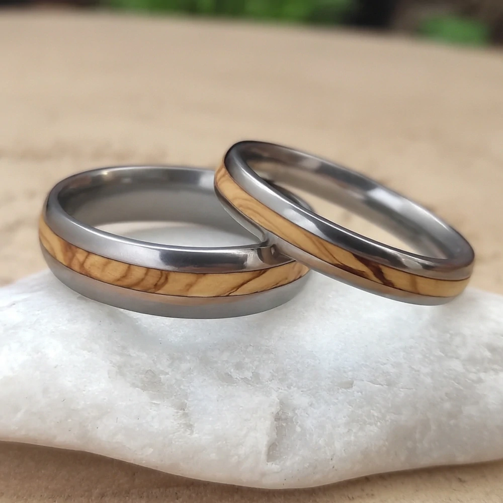 Ručně vyrobené snubní prsteny z titanu. Do prstenů bylo vsazeno dřevo oliva. Tyto prsteny představují eleganci a styl, jenž vyzdvihne jedinečnost a originalitu svého nositele. Tento přírodní šperk je vhodný pro ženy a muže, kteří se chtějí odlišit a prezentovat svou náklonnost k přírodě.