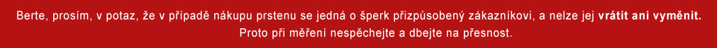 Rádi byste koupili prsten a potřebujete zjistit správnou velikost? Chcete mít opravdovou jistotu a překvapit vaši polovičku? S námi to hravě zvládnete. Prsteny v našem eshopu jsou vyráběny přesně na míru a při nákupu můžete velikost uvést přímo do poznámky v objednávce. Kdyby se přece jen stalo, že prsten nebude sedět, zdarma vám ho upravíme na přesnou velikost. Mějte však na paměti, že tento proces jde pouze z menší velikosti prstenu na větší. Nicméně, vše záleží na předchozím individuálním posouzení z naší strany.
